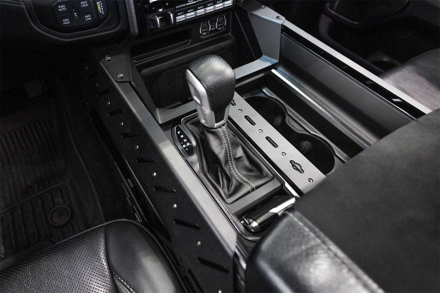 Our Center Console Molle Panels & Digital Device Bridge enables you to keep your everyday carry gear at arms reach. It was designed to flow with the interior lines of your truck's center console, and is finished in a dual-stage hammer black powder coat to complement the factory styling. Driver & passenger side molle panels offer mounting points for gear like pouches, multi-tools, holsters, or other molle accessories. Top plates with 10-24 PEM nuts run the length of the console and provide mounting points for RAM Mounts device holders. An additional bridge plate that crosses over the console features device mounting points, and is perfect for stowing your smartphone, GPS, radio mic, tablet, & other device holders. * Please Note: Drilling is required for installation. 3 Possible Configurations: Side Panels Only - The Side Molle Panels can be installed on their own, without the bridge. This offers you molle mounting options, as well as the upper side rails which are compatible with Ram Mounts device holders. Side Panels & Bridge - This configuration provides you with the maximum utility, offering plentiful molle mounting options, and versatile device holder mounting locations at both the sides and the center of the console. Bridge Only - Although the Device Bridge can be installed on its own, we strongly encourage you to install the side panels along with the bridge for the cleanest aesthetic.