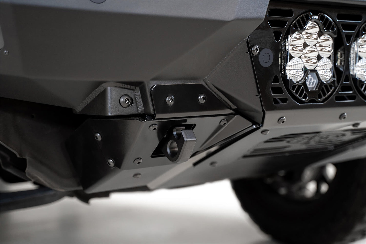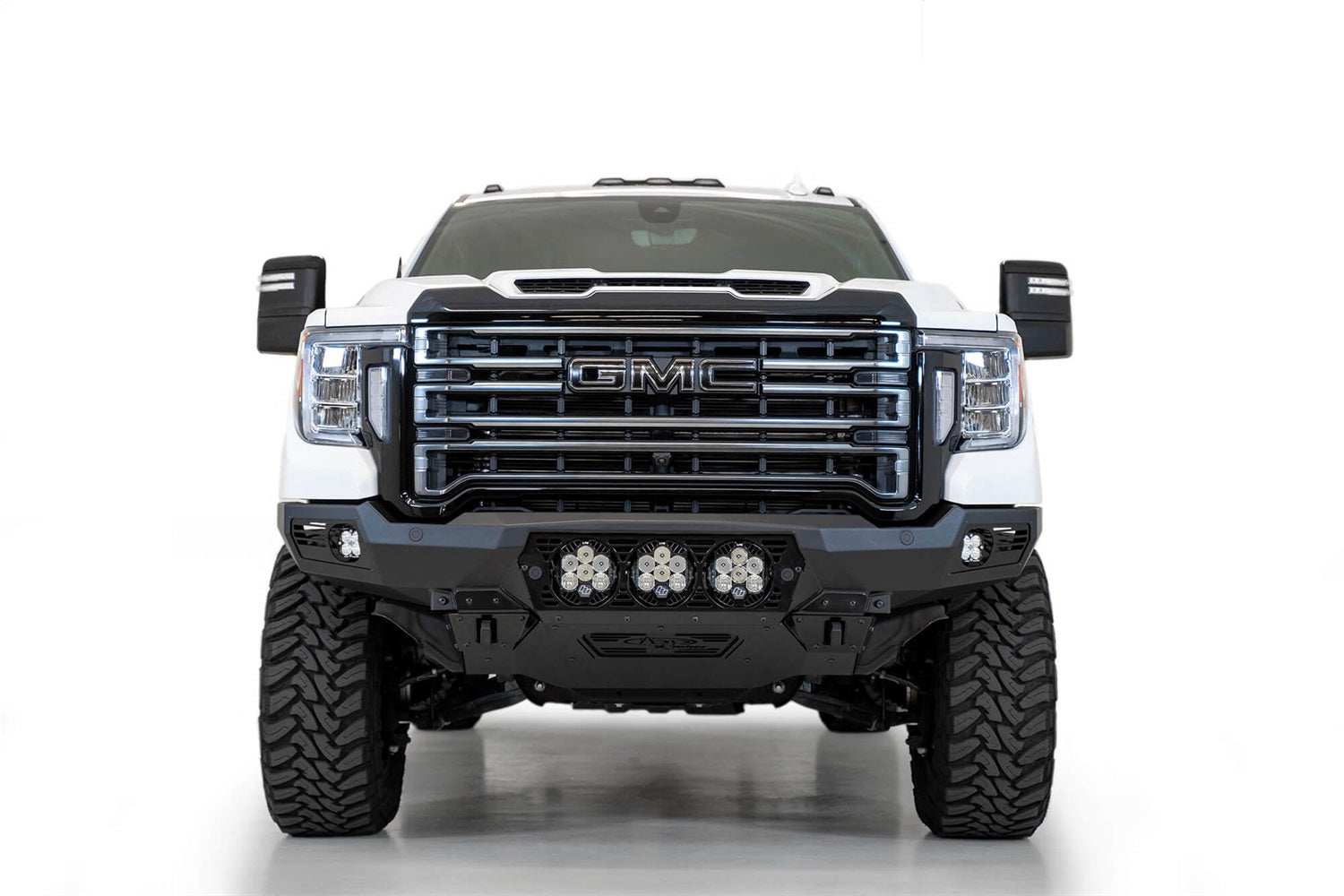 The ADD Offroad Bomber GMC Front Bumper is a slim fitting bumper for your 2020 and up GMC Sierra 2500/3500. A modern plate steel design gives a clean look, while the full 3/16" aluminum skid plate cuts down on weight. Reinforced mounts for 3/4" D-Rings bolt straight to your frame for unrivaled strength. The Bomber front bumper was designed to provide both superior protection, as well as adding a sharp look to the front end of you truck. This GMC 2500/3500 Front Bumper comes with three Baja Designs LP6 light mounts, and two additional cube light mounts behind the side panels. As always, this bumper is fully bolt-on and designed, engineered, and manufactured in America by ADD Offroad.