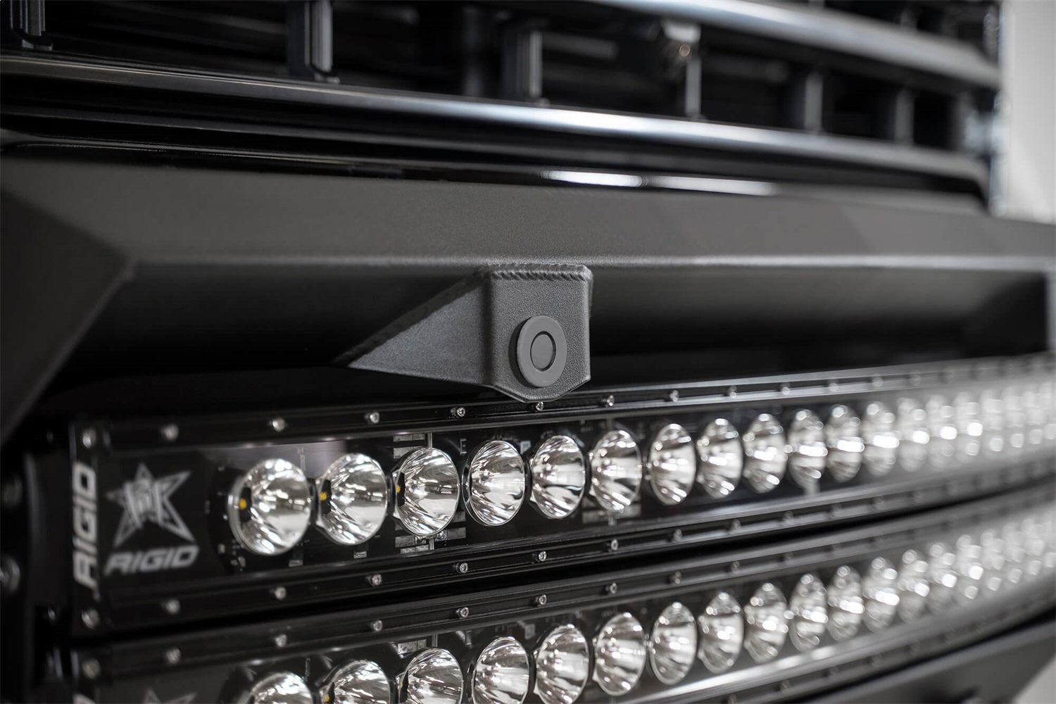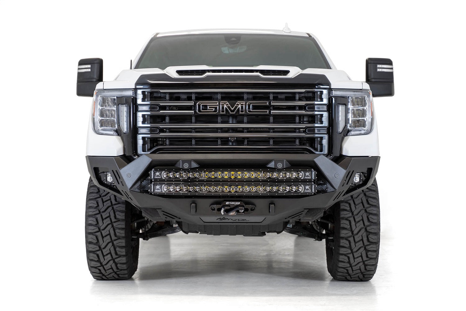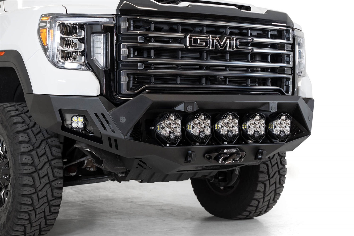 Heavy duty trucks call for heavy duty bumpers. The GMC Sierra 2500 Bomber HD front bumper features a rugged plate steel design. A separate plate mounts your Winch directly to the frame for unrivaled strength. Our reinforced clevis mounts provide a mounting point for 3/4 in. D-Rings for more added utility. Multiple lighting options are available, including six Rigid 360 series lights, five Baja Designs LP6 lights, or dual 40 in. radius light bars. One cube light can also be mounted behind each side panel. OEM parking sensors are retained. As always, this product is fully bolt-on and made in America.