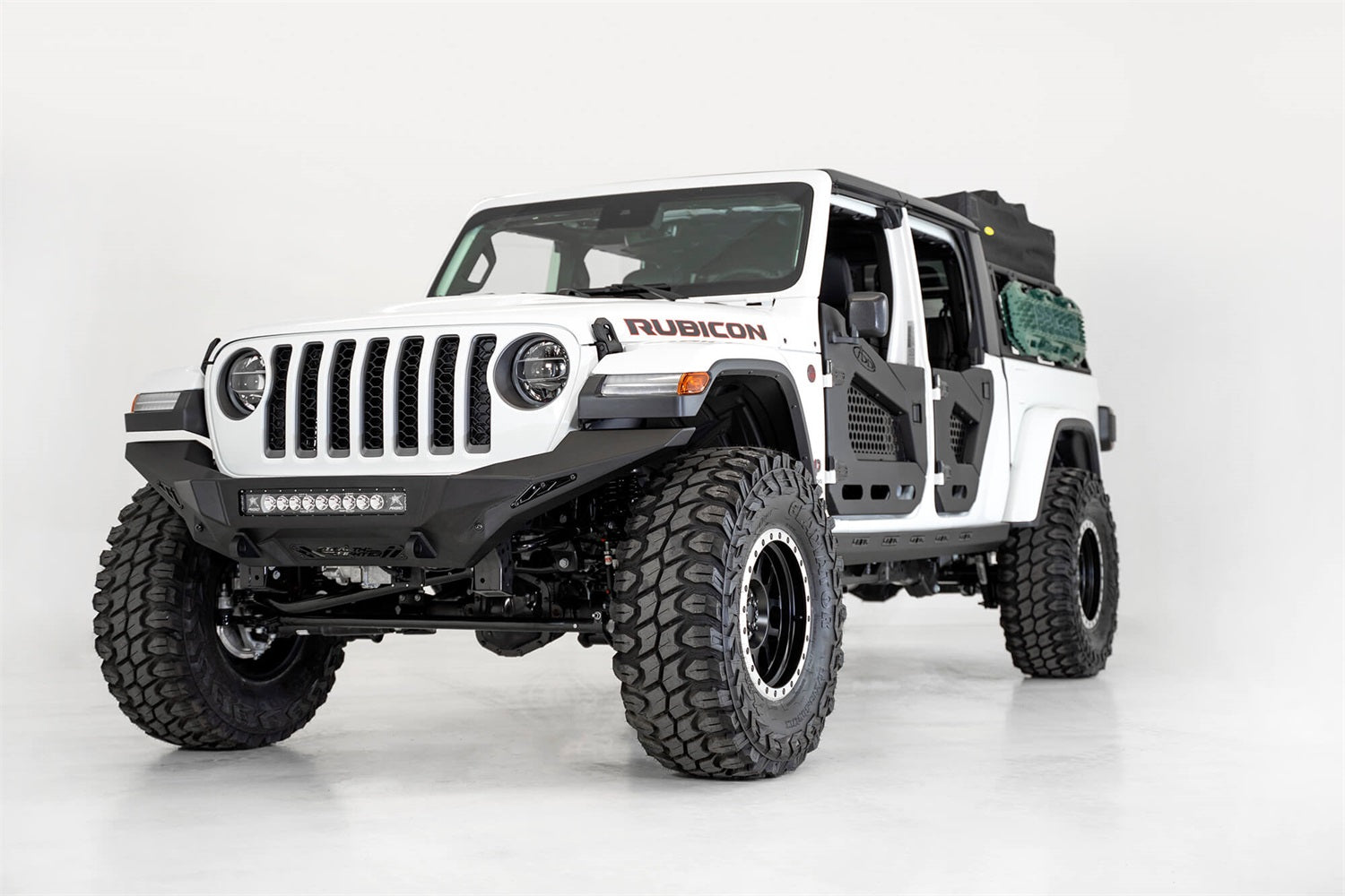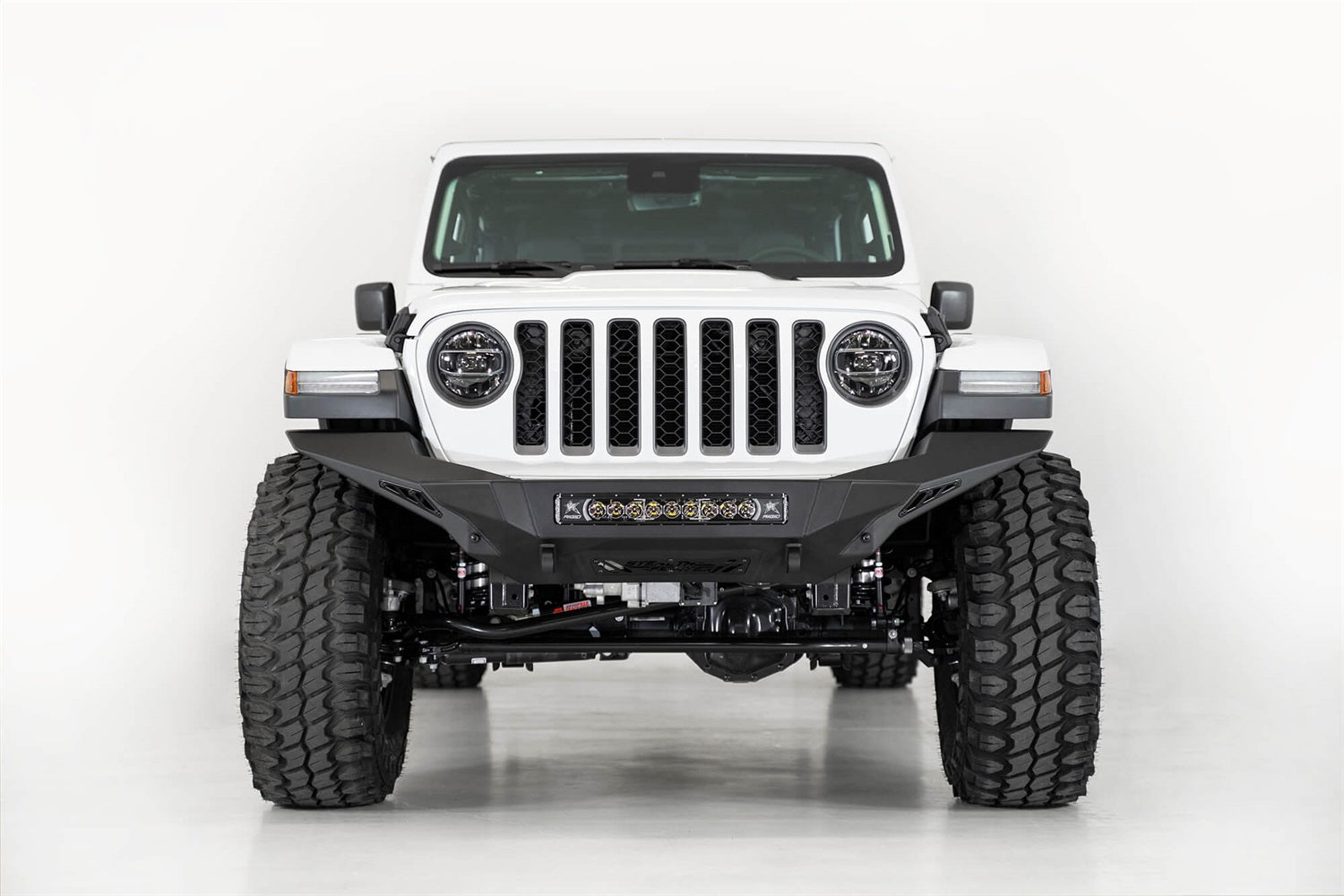 Transform the front end of your Jeep Wrangler JL or Jeep Gladiator JT with the Stealth Fighter Full Length front bumper. A radius plate steel construction gives your Jeep the perfect combination of strength and style, while the extended side panels create a seamless transition between the bumper and fenders. A patented universal light mounting system in the center of the bumper allows you to mount any size and brand of light up to a 20" radius light bar or 5 cube lights. Two front reinforced clevis mounts accept a 3/4" D-Ring to help out in tough situations.The Stealth Fighter Jeep JL/JT front bumper provides a greater approach angle to maximize offroad performance and an optional top hoop configuration is available for additional protection. Available in both winch and non-winch configurations for Jeep enthusiasts who need the added utility. This completely bolt-on Jeep JL/JT front bumper comes in hammer black powder coat with satin black powder coat panels.