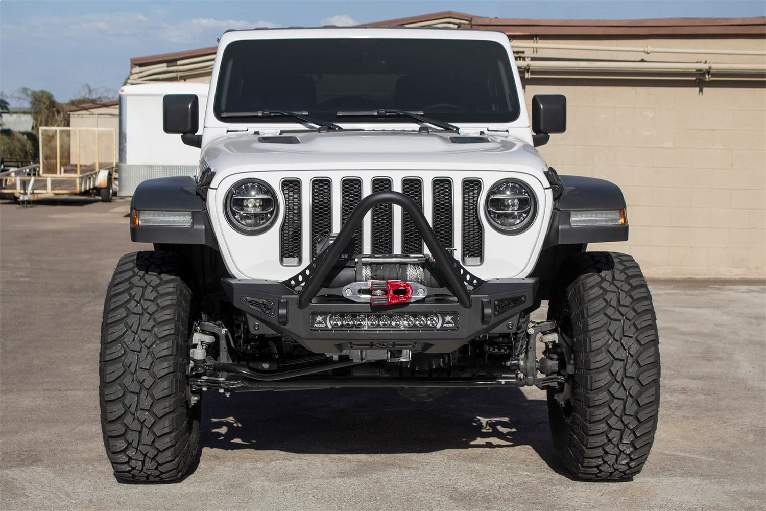 Transform the front of your Jeep with the Addictive Desert Designs Rock Fighter front bumper. The Rock Fighter is a stubby width bumper, meaning it will look good with any aftermarket fender you want to put on your JL. The patented universal light mount system in the center of the bumper allows you to mount any brand/size of light up to a 20" RDS or 5 cube lights. There are two additional cube light mounts on each top corner of the bumper. The two clevis mounts on the front of the bumper accept a 3/4" D-Ring and are reinforced to help out in tough situations. The Rock Fighter provides a greater approach angle to maximize offroad performance and two different top hoop options for even more front-end protection. This bumper is available with a low profile top hoop or a stinger. The main bumper structure comes in hammer black powder coat with satin black panels. This product is fully bolt-on and made in America.