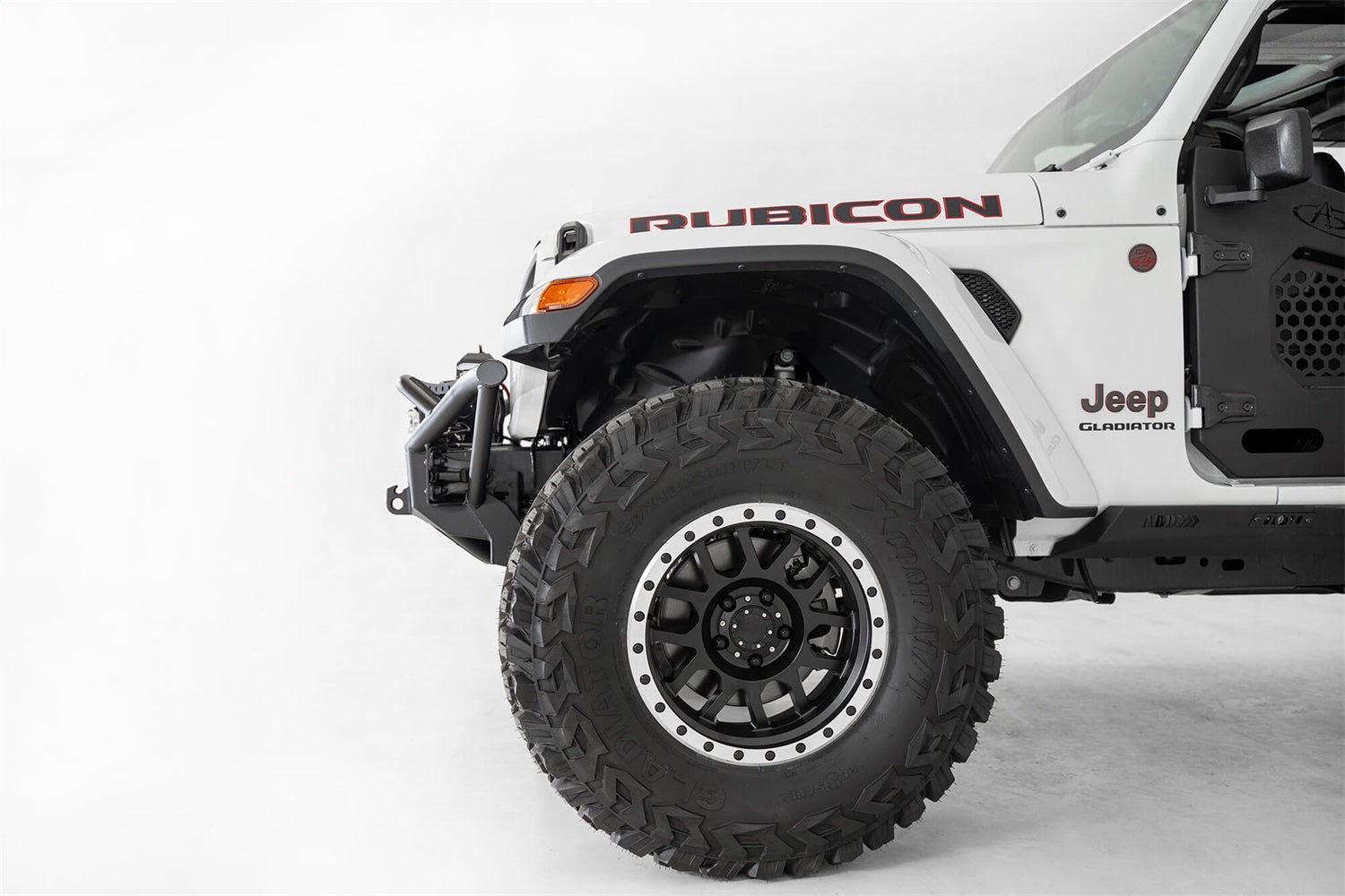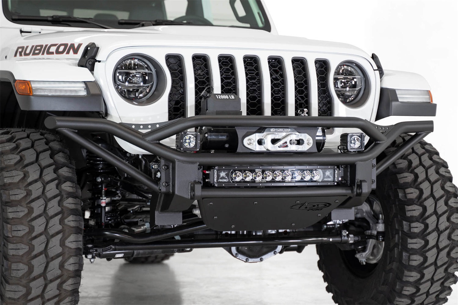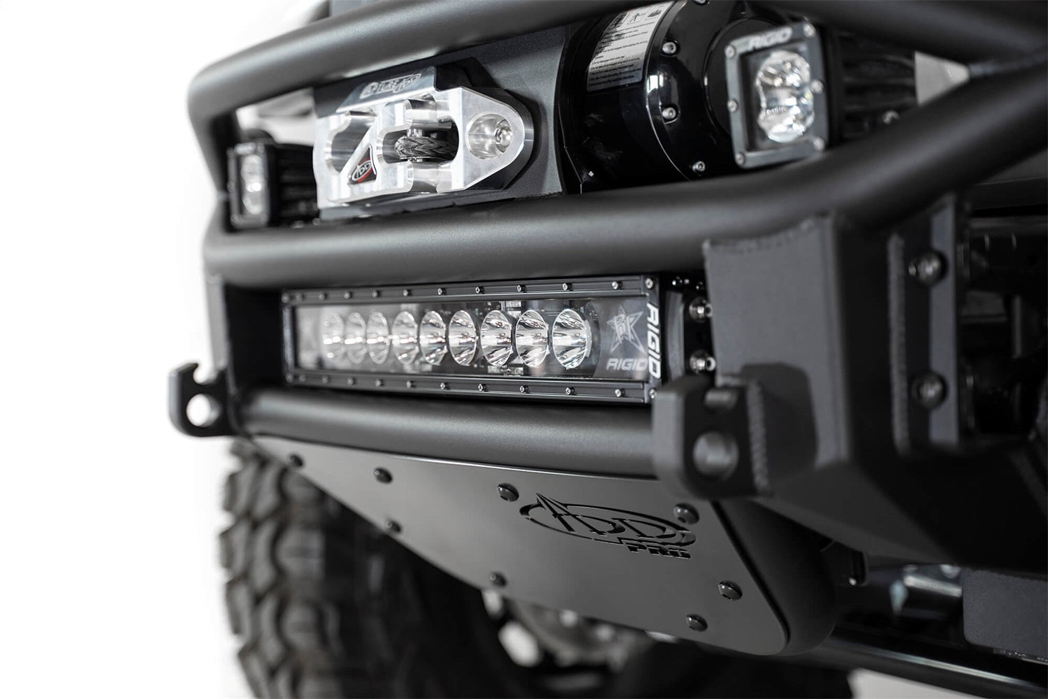 The ADD PRO Bolt-on front bumper for the Jeep Wrangler JL/Jeep Gladiator JT brings the race inspired pre-runner look to the Jeep market. A formed main tube keeps the bumper tight to the front of the Jeep while still giving a unique style that flows seamlessly with the vehicle's body lines. A universal light mount in the center of the bumper gives the option of a 20" radius LED bar or up to 5 cube lights. There are two additional cube light mounts within the top hoop. Standard winch mount and reinforced D-ring mounts provide added utility.
