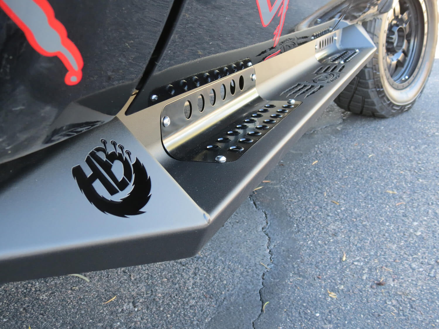 The Honey Badger Side Steps are the latest truck product offered by ADD. This step was designed to be the perfect addition to the innovative Honey Badger Front and Rear Bumpers, yet be able to stand alone. The step itself boasts unique styling from a laser cut Honey Badger Logo, to an all welded body, to removable step plates that can be color matched for complete customization. The step is also available with access lighting that helps to ensure you can always find the step in dark lit areas. All ADD side steps utilize factory mounting positions that allow for easy installation and come standard with a three stage powder coat finish that will ensure your steps will stand up today's tough weather conditions.