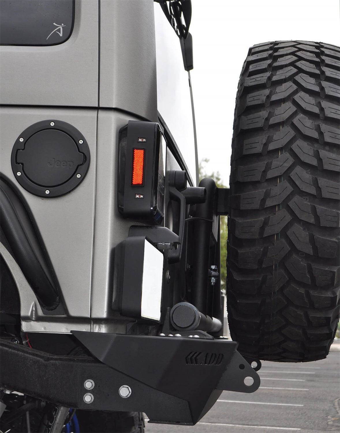 The Jeep JK Stealth Fighter tire carrier is a great option for the Stealth Fighter rear bumper. Direct bolt on unit with one hand rear door opening action and capable of holding a 40 in. rear tire. The hinge design takes the weight off the tailgate, but still operates as easily.