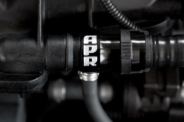 The APR Modular Boost Tap and PCV Bypass System plugs directly into the intake manifold and makes several configuration options available. The APR Modular Boost Tap features a tap used for referencing boost or vacuum from the manifold and a cap if this feature is unneeded. A T-junction allows for multiple boost and vacuum references and a 'no buzz' restrictor pill allows for proper manual boost gauge operation. The system also includes a threaded PCV plug, allowing the PCV system to operate as intended by the OEM, as well as blocked off if needed for a specific PCV or catch-can setup. Furthermore, temporarily installing the threaded plug allows for quick diagnosis of the PCV valve for boost leaks. This innovative and modular design ensures operation with all boost, vacuum and PCV system combinations, leaving no compatibility worries for future configurations.