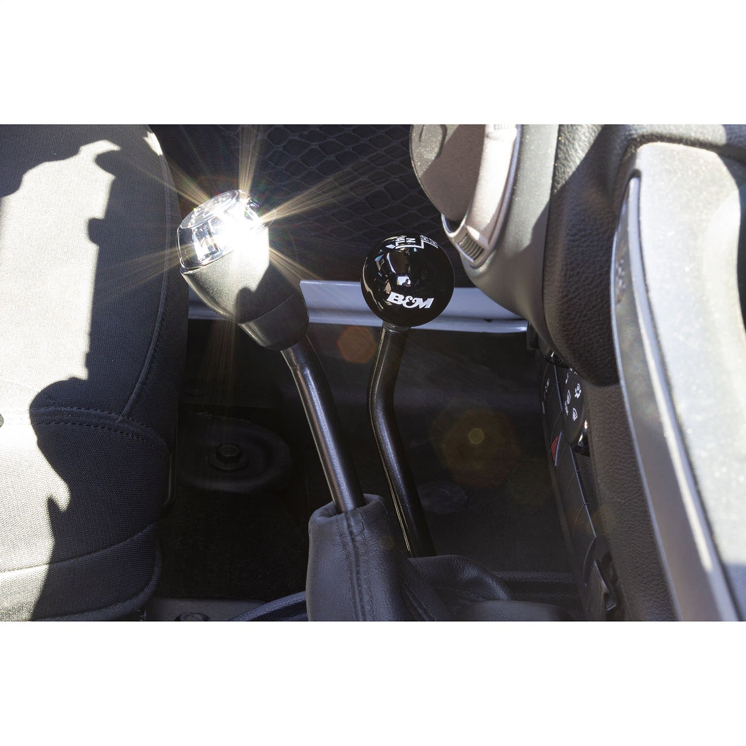 Introducing B&M's new extended transfer case shift handle for 07-18 Jeep Wrangler JK models. The extended handle allows for easy reach and operation while allowing shifting in/out of gear ranges without having to reach down. The extended length also provides additional leverage which reduces the effort required to shift. This handle is manufactured from machined billet aluminum and 4340 steel, replacing the weaker plastic OE unit. Includes a black shift knob and a very easy direct fit-installation.