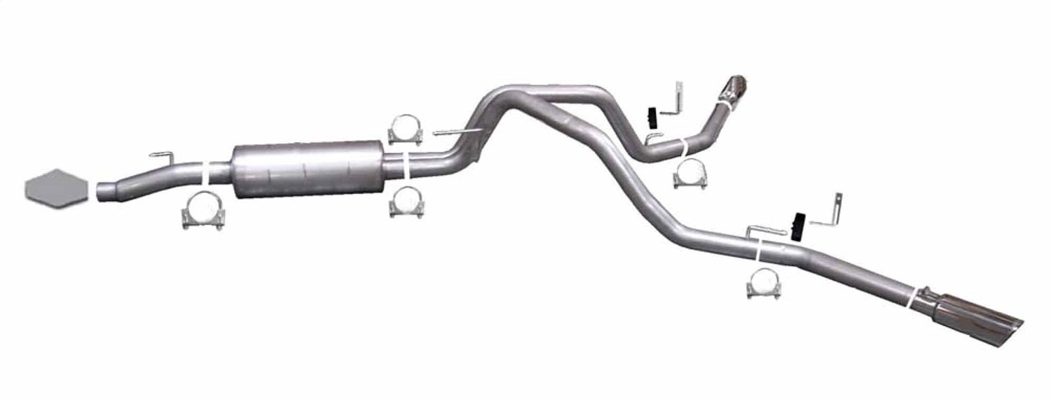 For the extremist who wants to take their truck to the next level, this dual bolt-on Cat back system is for you. This system exists behind the rear tires at an aggressive angle with a powerful exhaust tone. You will gain bold street looks with powerful dyno tuned and tested street performance gains. You can expect to experience gains on average of 15-20 horsepower. Gibson muffler provides a mean performance sound and complemented with polished Stainless Tip. Easy bolt-on installation. No welding required. Backed by a Lifetime Limited Warranty. If you want Extreme, this system is it.