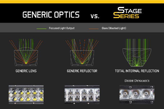 Designed For Performance. Using optical simulation modeling, Diode Dynamics Stage Series light bars have been designed for maximum functionality, with compact size, custom-engineered TIR optics, and a useful beam pattern, all in a highly durable package. Our light bars shine light in a highly-functional and useful beam pattern, much more focused than older LEDs on the market.