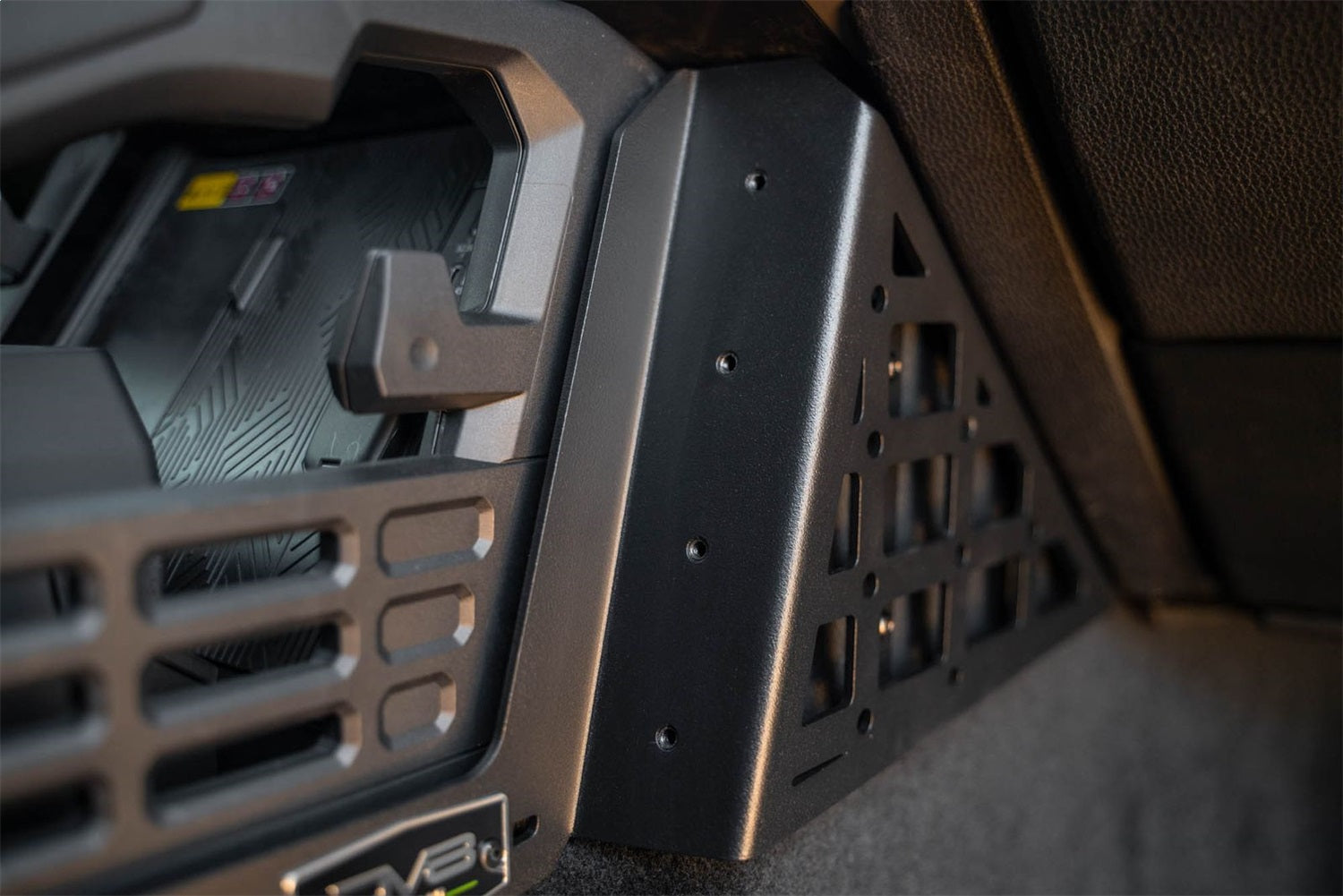 Improve your interior storage capabilities with our Center Console Molle Panels and Device Mount. You can mount multi-tools, med kits, sheaths, holsters, and other molle accessories to the driver and passenger side panels for quick access to your daily gear. You can also utilize clip mounts for attaching pouches and other supplies. The tops of the panels are equipped with M5 PEM nuts that are compatible with Bulletpoint and RAM Mounts for storing your smartphone, GPS, radio, or tablet in a convenient and accessible location.These molle panels retain use of the factory cup holders & passenger side grab handle, and they bolt-on to the sides of your console with only some minor drilling required for installation. The panels are made from high-quality 3.5mm steel for a rigid design that will keep your gear secure even when jostled on rough terrain. They are finished in a micro-texture black powder coat finish that compliments your truck's interior styling. * Please Note: Minor drilling is required for installation.