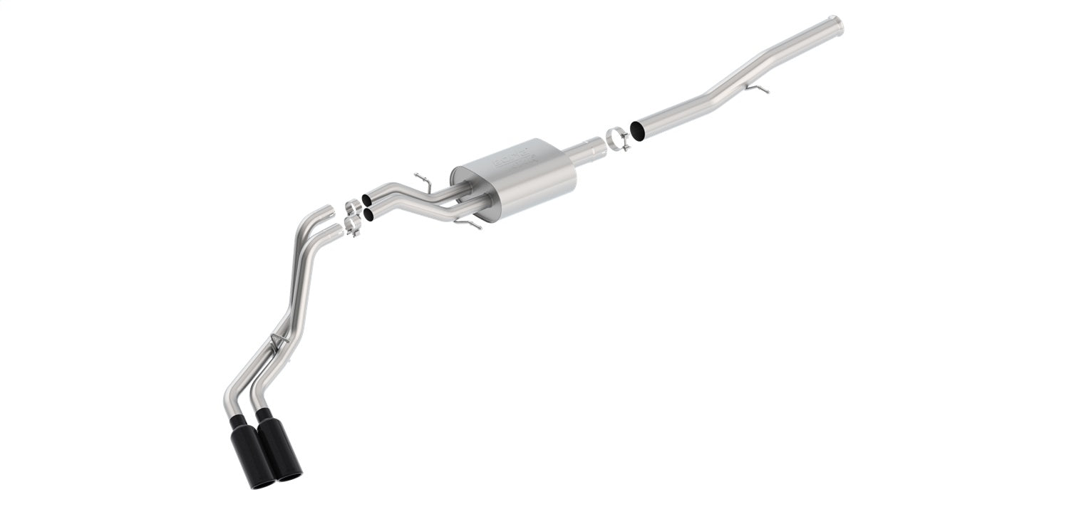 This system features the aggressive ATAK(R) sound and exits through 4 in. black chrome on T-304 stainless steel tips. Using BORLA(R) Stainless Steel Polish p# 21461 is NOT recommended with these black chrome tips. We suggest cleaning the tips with hot water and a microfiber cloth. BORLA(R) Cat-Back(TM) and Axle-Back exhaust systems feature patented straight-through and multi-core technology designed to unleash hidden horsepower. Increased exhaust velocity adds power, driving excitement, fuel economy, and the distinctive BORLA(R) Sound of Power respected by motoring enthusiasts everywhere. Each system is built from premium T-304 stainless steel, superior to T-400 series knockoffs (such as 409), to give you the absolute best in performance and durability. Ultra-smooth mandrel bends ensure maximum flow & power, and precision computer numerical control (CNC) manufacturing ensures an accurate fit. Best of all, BORLA(R) stands behind every system with a Million-Mile Warranty. Just what you'd expect from the world's most experienced (and most winning) exhaust brand.