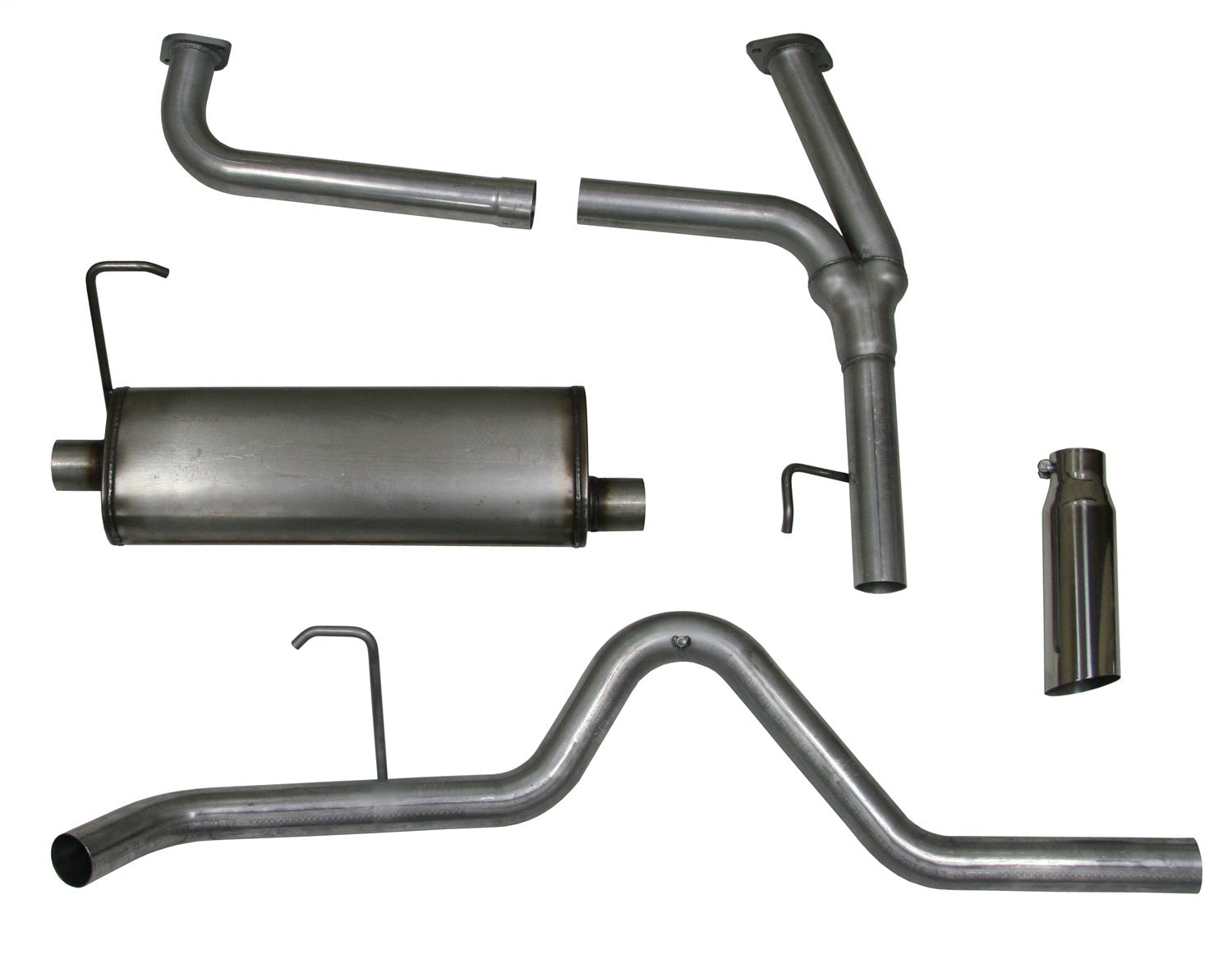 Cat Back Exhaust System; Tube Size 2 1/2 in.; Collector Size 2 1/4 in.; Incl. Y-Pipe/Muffler/OverAxle Pipe/Tailpipe/Hdw/3 1/2 in. Polished Tip; Pass. Exit; Stainless Steel;