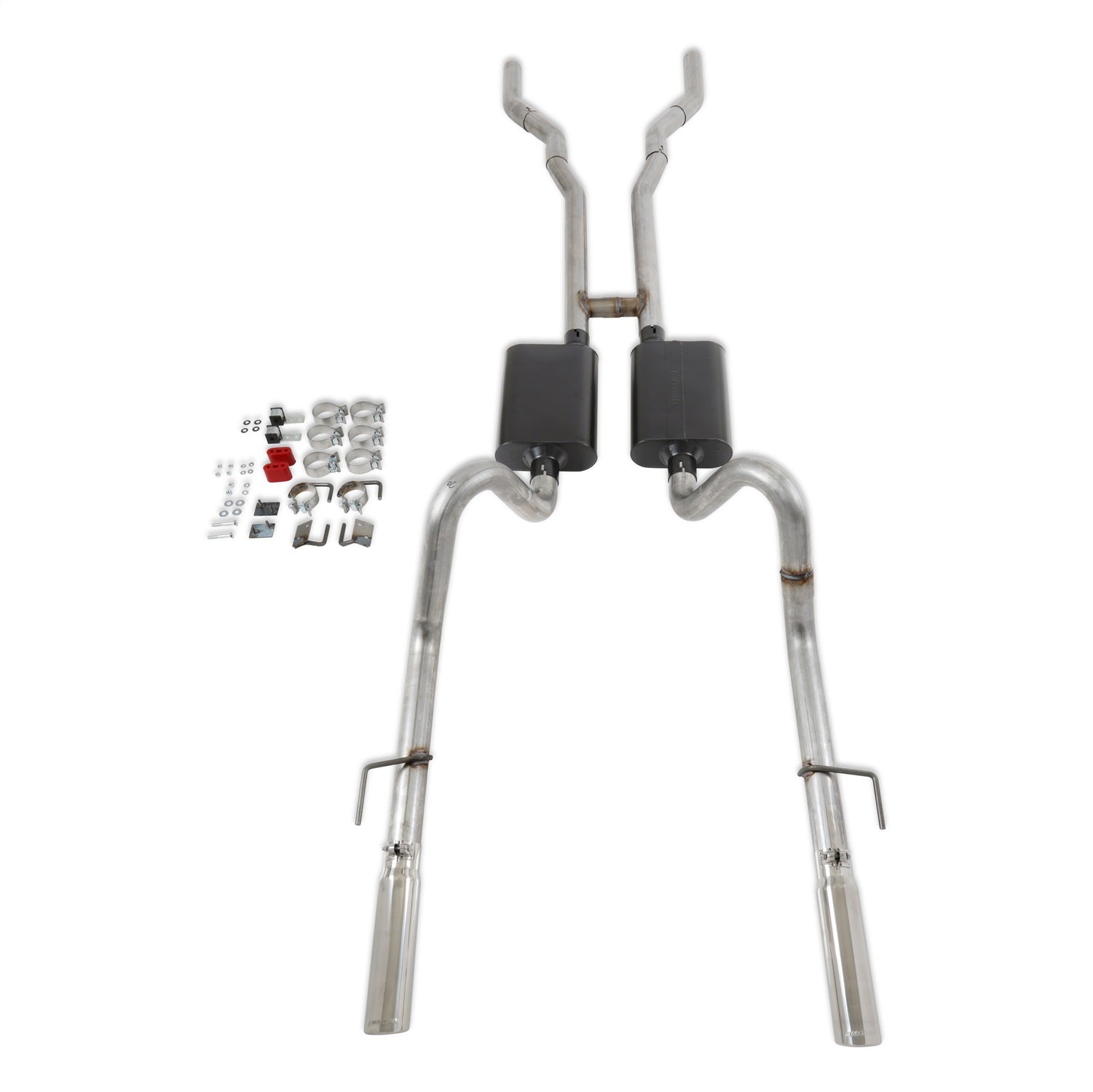For the person who is looking for a true dual crossmember-back exhaust system with an moderate to aggressive exhaust tone. With an easy fit in mind, these systems are constructed from 16-gauge mandrel-bent stainless steel tubing with a built-in H-pipe crossover, a pair of specially selected Super 44 Series mufflers and includes all hangers and hardware necessary for installation. This system fits through the factory rear valance exhaust cutouts and includes a pair of 3.00-inch polished stainless steel tips. The American Thunder systems deliver a moderate to aggressive interior and exterior tone and are best suited to the enthusiast who wants their performance to be heard. Like all Flowmaster exhaust systems, the benefits include improved throttle response, power and mileage. If you prefer aluminized steel construction, check out optional system# 17281. Notes: Does Not fit convertibles or cars with staggered shocks. Does Not include header reducer cones or downpipes for factory manifolds.