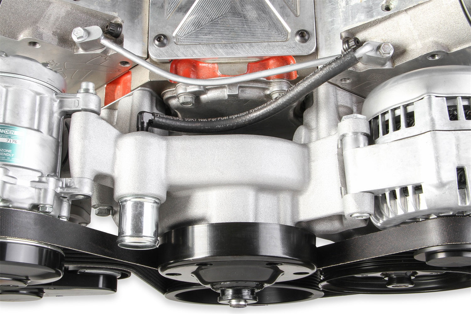 Accessory Drive System Kit; Natural Finish; GM LS; Mid-Mount; Bracketless; Incl. SD7 A/C Compressor/Alternator/P.Steering Pump/Crank Damper/Tensioner/Belt/Pulleys/Hose Adapters;