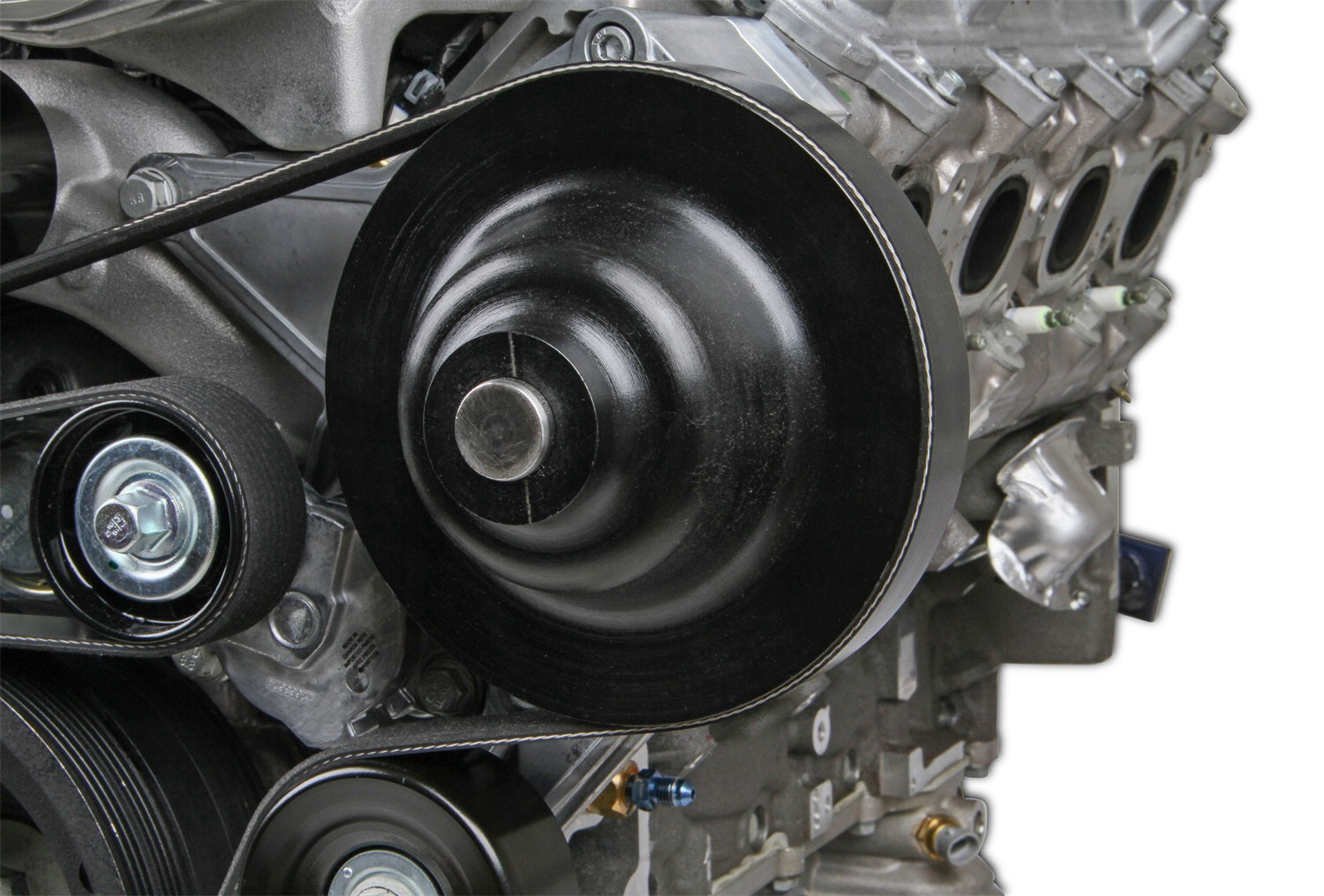 Holleys complete accessory systems for LT4 and LT5 applications have all accessories pulled up and in tight. Plus, they add the much needed hydraulic power steering solution. There are no shortcuts here. Holley incorporates a splined dual bearing system that eliminates all belt stresses on the P/S pumps internal bearings, assuring long life. The supercharger drive maintains the original and optimized belt path and tensioner. The accessory layout is as if the original manufacturer had designed it for your swap application. Included with each drive system is a throttle body angle correcting adapter that better positions the TB for swap applications as opposed to the aggressive original application intended angles. Versions of these accessory drives are available for both wet and dry sump applications.