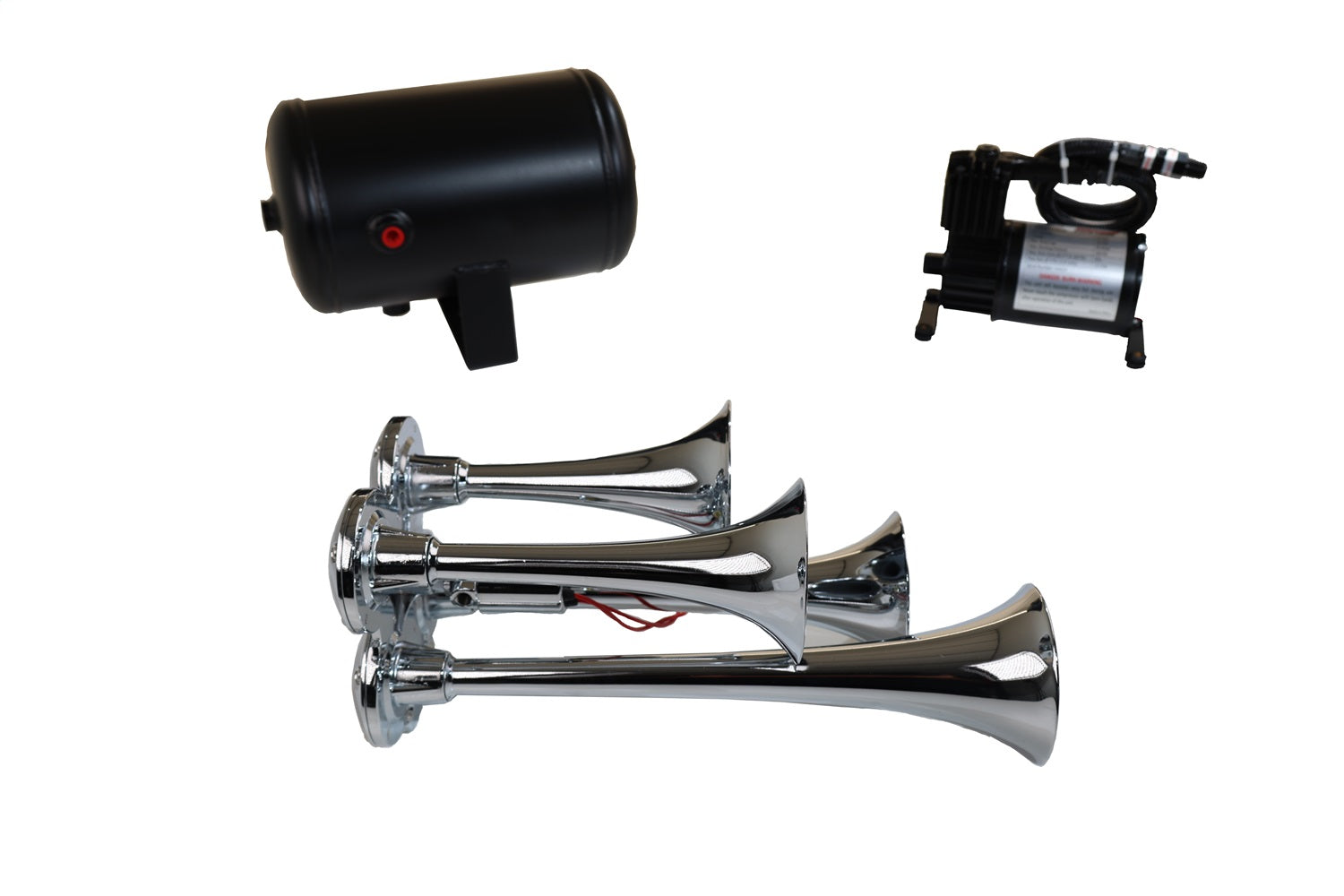 Quad air horn with four tuned trumpets 13 inches, 11 inches, 8.5 inches and 7 inches in length. Additional trumpets create a more fully-blended tone while being compact enough to fit almost any vehicle. Includes an easy-to-fit, 130 PSI, 1 gallon air system. Available in chrome or XCR2.0(TM) black finish P/N HK4-1.