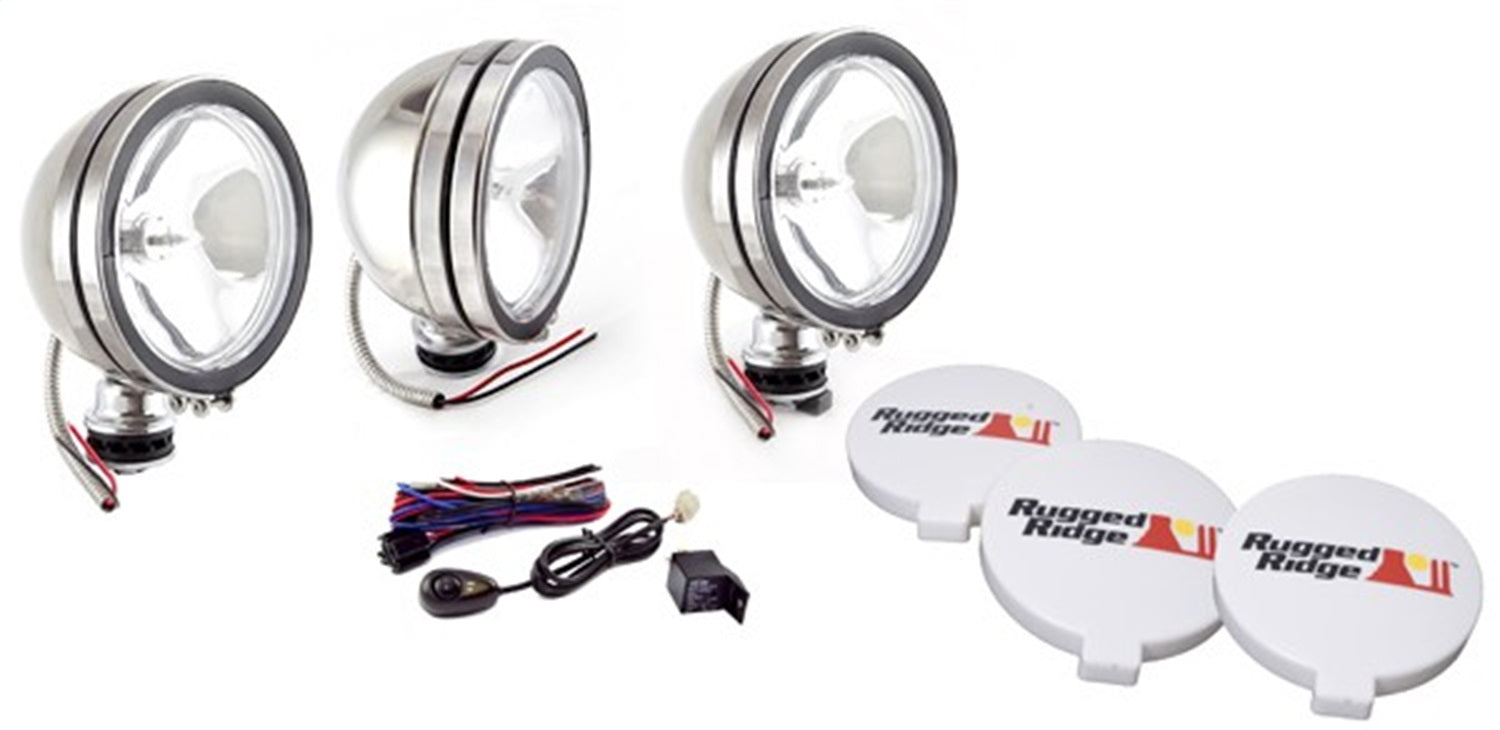 Off Road Light Kit; 6 in.; Round; Stainless Steel; Incl. 3 Lights/Wiring Harness/Stone Guards/Illuminated Dash Switch;