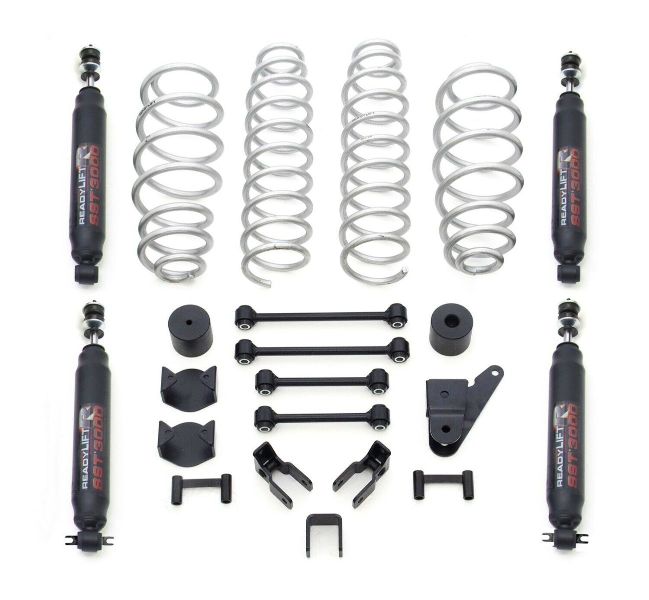 ReadyLIFT(R) Suspension is happy to announce that we have developed a new SST Lift Kit category for the Jeep JK Wrangler that is made right here in the U.S.A. These exciting new SST Lift Kits are designed to maximize the Jeep owners on and off road experience without having to break the bank! The NEW ReadyLIFT Jeep JK 8-Arm SST Lift Kits are a great option for the Jeep owner who wants more than just a lift kit, but doesn't require the need for an over-the-top expensive 8-arm suspension system. Our new control arms feature our TCT - Terrain Control Technology flex joints contained in heavy duty forged housings that bolt right up in replacement of the inferior factory control arms. This new 8-arm system allows the Jeep owner to have a lifted JK that rides great and performs outstanding even in the roughest terrain. If you want the best lift component offering in a kit that doesn't break the bank, our new 8-arm SST Lift kits are exactly what you need. Available in both 4" and 2.5" lift heights, these kits also include important bolt-on accessories such as a special designed plate steel rear track bar bracket to correct roll center and track bar placement, a new heavy duty front track bar and extended length sway bar end links keep your JK handling properly.