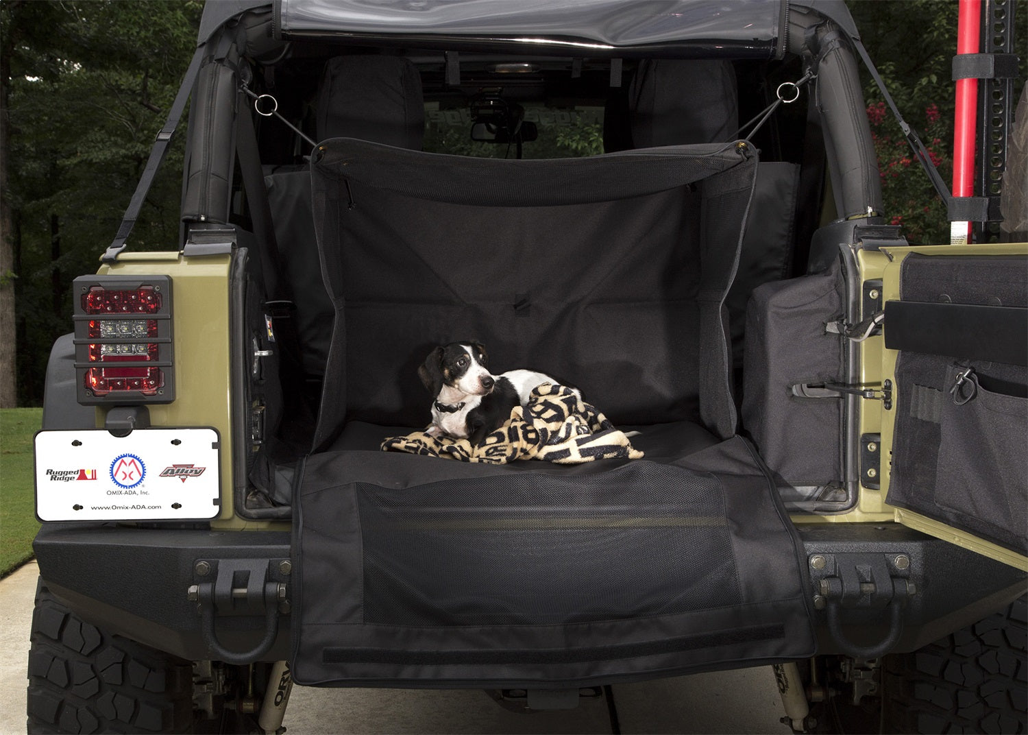 Bringing your canine companion along for a Jeep ride is really what it's all about. In the past, this has meant one of two things. Letting you four-legged friend run free inside the cab of the Jeep or lock them up inside a conventional pet carrier. The Rugged Ridge C4 Canine Cube aims to change all that. Our unique soft-side design suspends from the sport bar and anchors itself to the factory floor hooks- a design so innovative that the canine carrier folds flat to the floor when not in use and can be reconfigured in moments. Constructed from heavy-duty ballistic weave fabric with mesh-screened walls, the C4 Canine Cube keeps your pet safely contained inside while permitting good visibility and air flow to your prized passenger. Plastic-reinforced floor panels provide an added layer of protection to your inter carpet and trim while UV-resistant materials resist fading. The C4 Canine Cube for 2007-2018 Wrangler JK is an ideal complement to our C3 Rear Cargo Cover for comprehensive cargo area protection that keeps your pets best interests in mind.