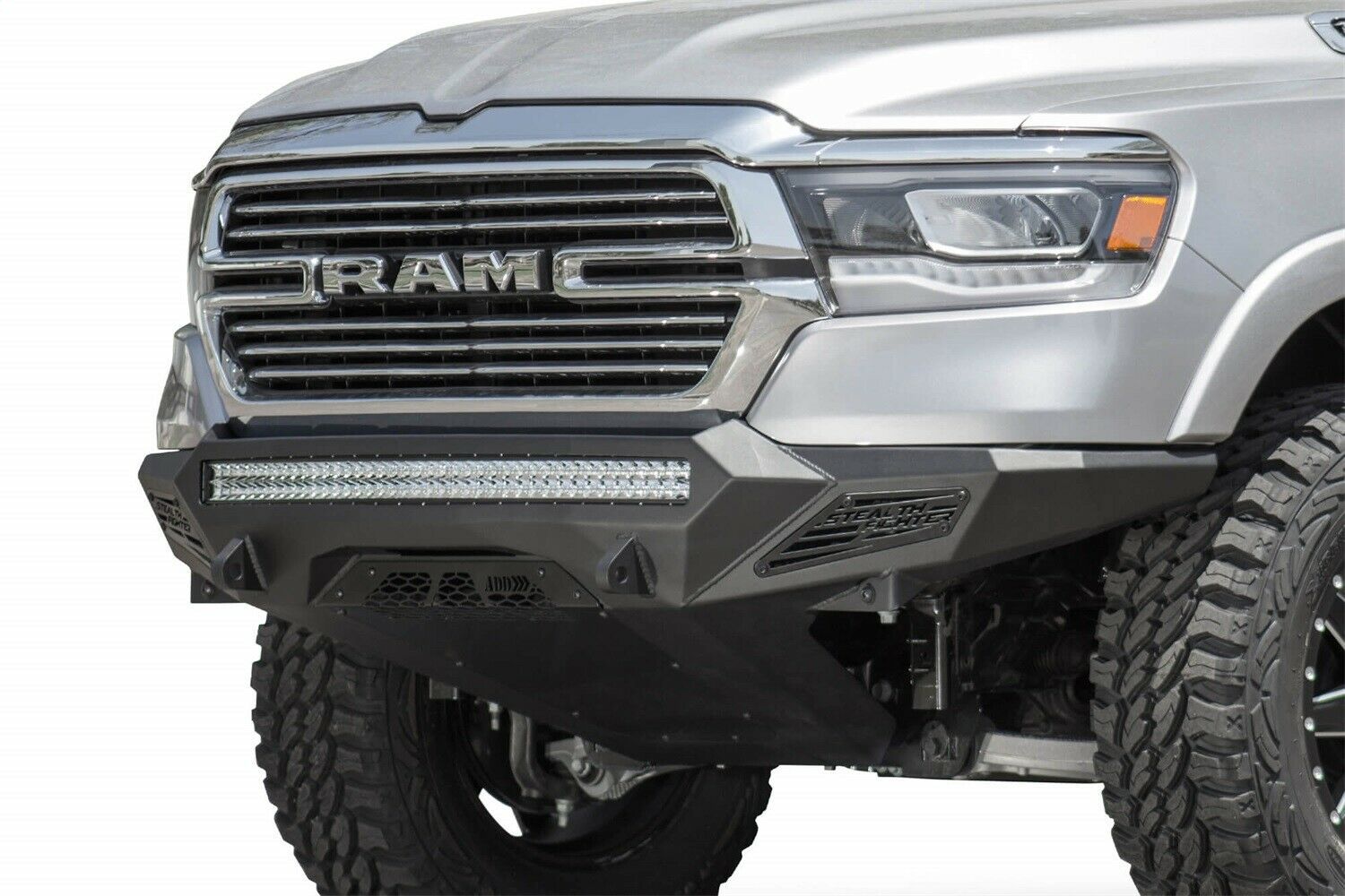 The Dodge RAM 1500 has never looked better with the Stealth Fighter front bumper. A radius steel plate design gives your RAM truck added front end protection without all the extra bulk. Matching the RAM 1500 factory body lines, the Stealth Fighter front bumper is a tight fitting steel plate bumper that compliments the RAM's look. A patented universal light mount system allows mounting up to a 40" radius LED or 10 cube lights. Mount any combination of brand, size, and style light to give your Dodge RAM front bumper the added lighting that you need. Fully bolt-on means there is no cutting or welding required to install the Stealth Fighter front bumper. Reinforced D-Ring mounts provide your truck with added utility to pull through any tough situation, while optional parking sensor cutouts retain your truck's OEM amenities.