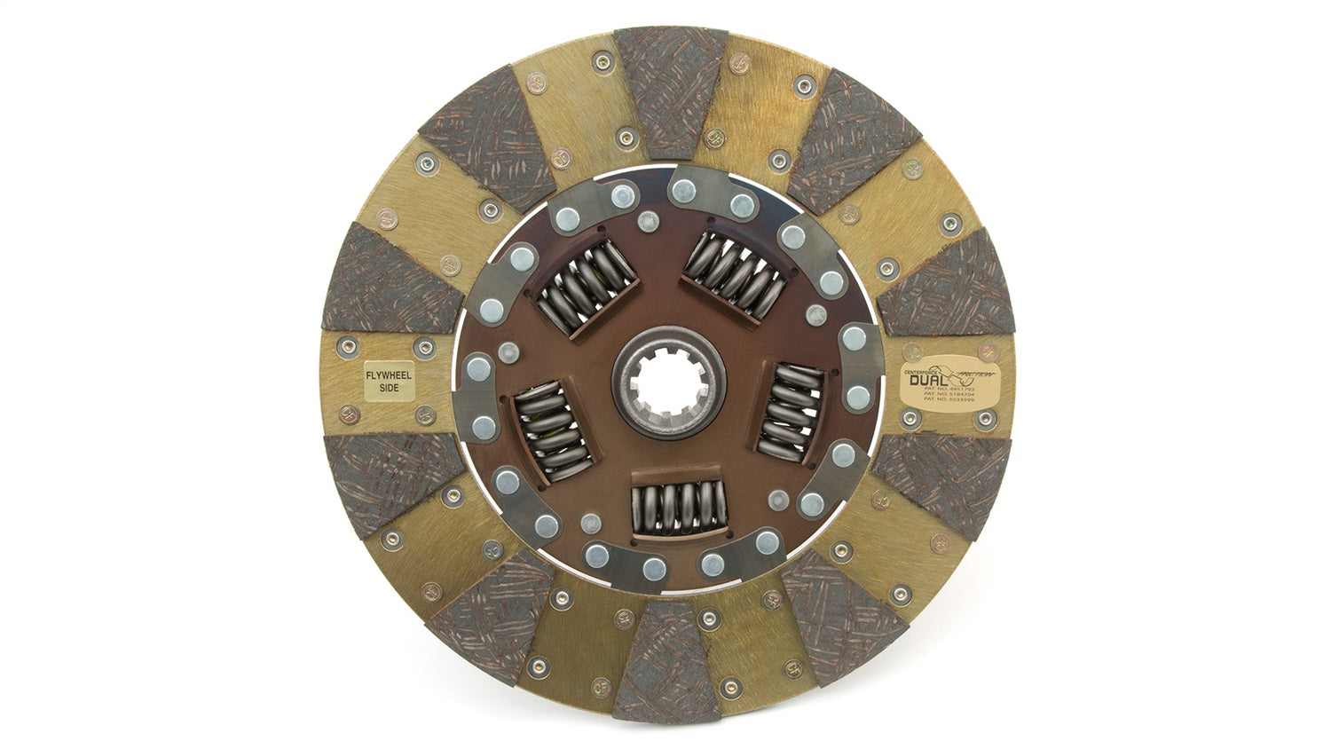 The Centerforce(R) Dual Friction(R) Disc Series uses a single disc with patented dual friction technology by distributing pressure plate clamp force evenly over a 360-degree friction-facing on one side of the clutch disc, while the opposing side uses a segmented friction-facing to concentrate clamping pressure and increase clutch holding-capacity. These discs are made for Centerforce Dual Friction pressure plates.