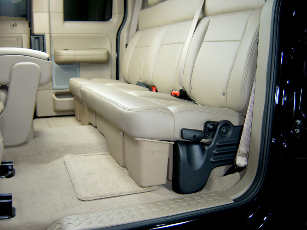 Whether you're a contractor, sportsman, or simply someone looking for a great way to organize your pickup truck, the DU-HA(R) is perfect for you. The DU-HA(R) allows you to store your guns and gear - ammunition, hunting gear, fishing gear, tackle, GPS, binoculars, power tools, rain gear, tow ropes, tie down straps, first aid kit, bungee straps, jack, hats, boots, gloves, jackets, chains, jumper cables, and more - safely and securely underneath the back seat of your truck. Each DU-HA(R) is made specifically to fit a particular make and model of truck, so the fit is perfect. This also maximizes the available storage area. Easy to install. Simply lift the rear seat, slide it in, and fasten it in place! After using a DU-HA(R) underseat storage unit, you'll wonder how you ever got along without it!