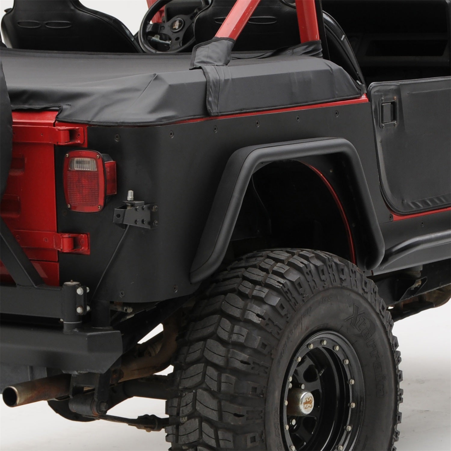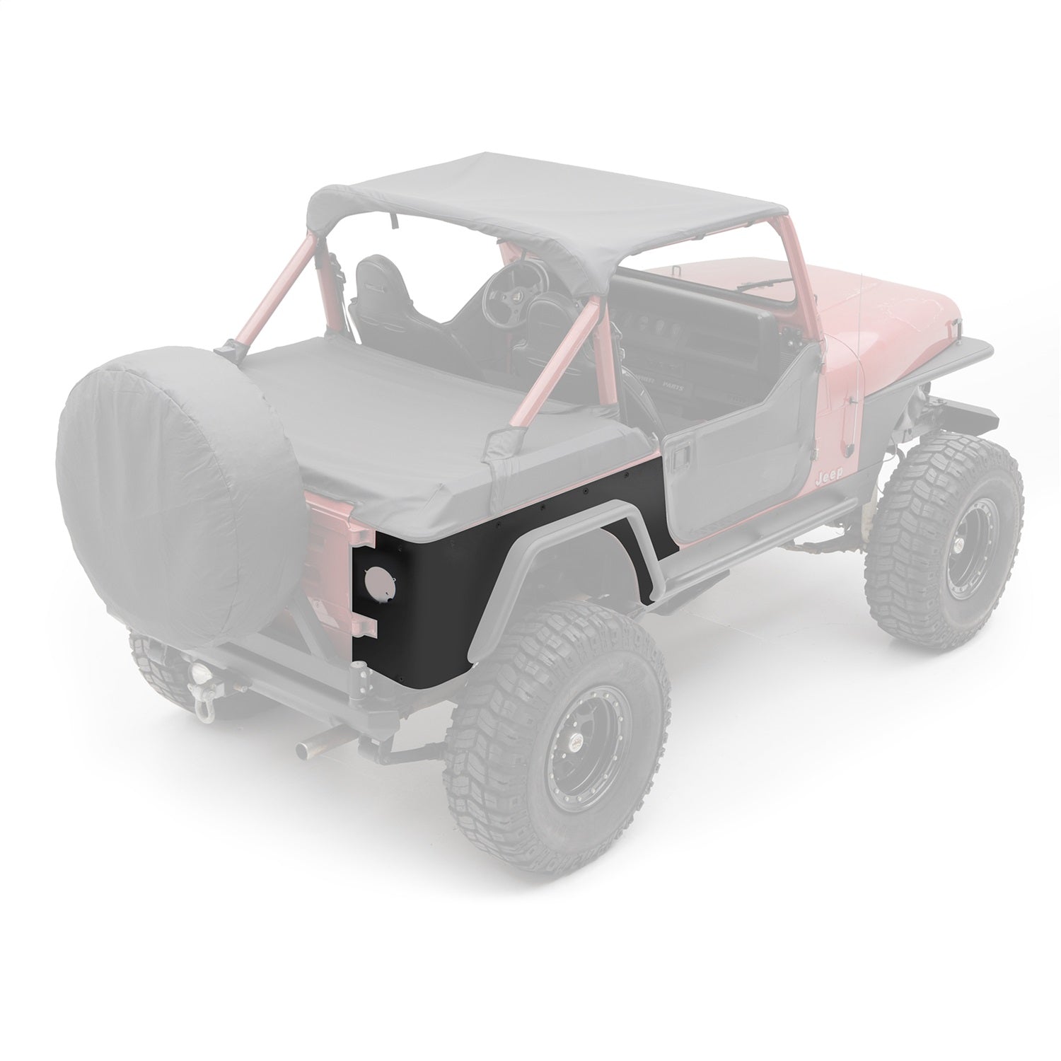 Manufactured from 3/16 inch cold roll steel and hand crafted to insure a perfect fit every time. Optional 3 inch flare extension available, see part number 76877. Stainless steel hardware included. Includes cutouts for factory tail lights and fuel filler. Finished in a black powder coat. Can be used with rocker sliders. Drilling required.