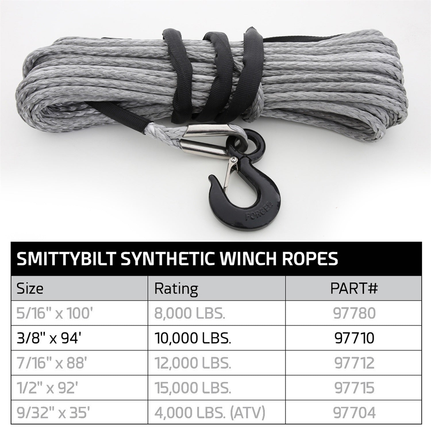 Smittybilt'S XRC Synthetic Winch Rope Is Manufactured From Dyneema Sk-75 Which Is Lighter And Stronger Than The Traditional Steel Cables Plus It Won'(TM)T Kink, Curl Or Splinter. Each Of Our Ropes Is Specially Treated To Be Uv Stable As Well As Heat Treated. All Of Our Ropes Include A 10'(TM) Protective Sleeve; Stainless Steel Thimble And Safety Hook With Connector Link Which Means It Comes Complete With Nothing Else To Buy.